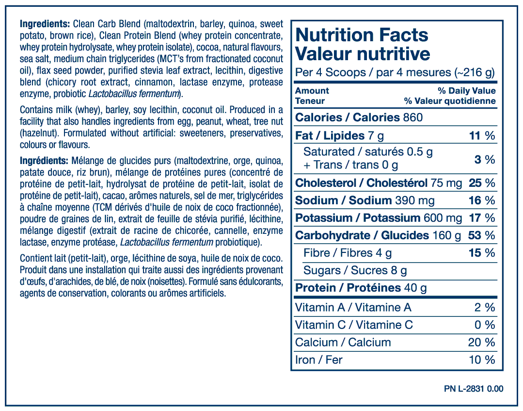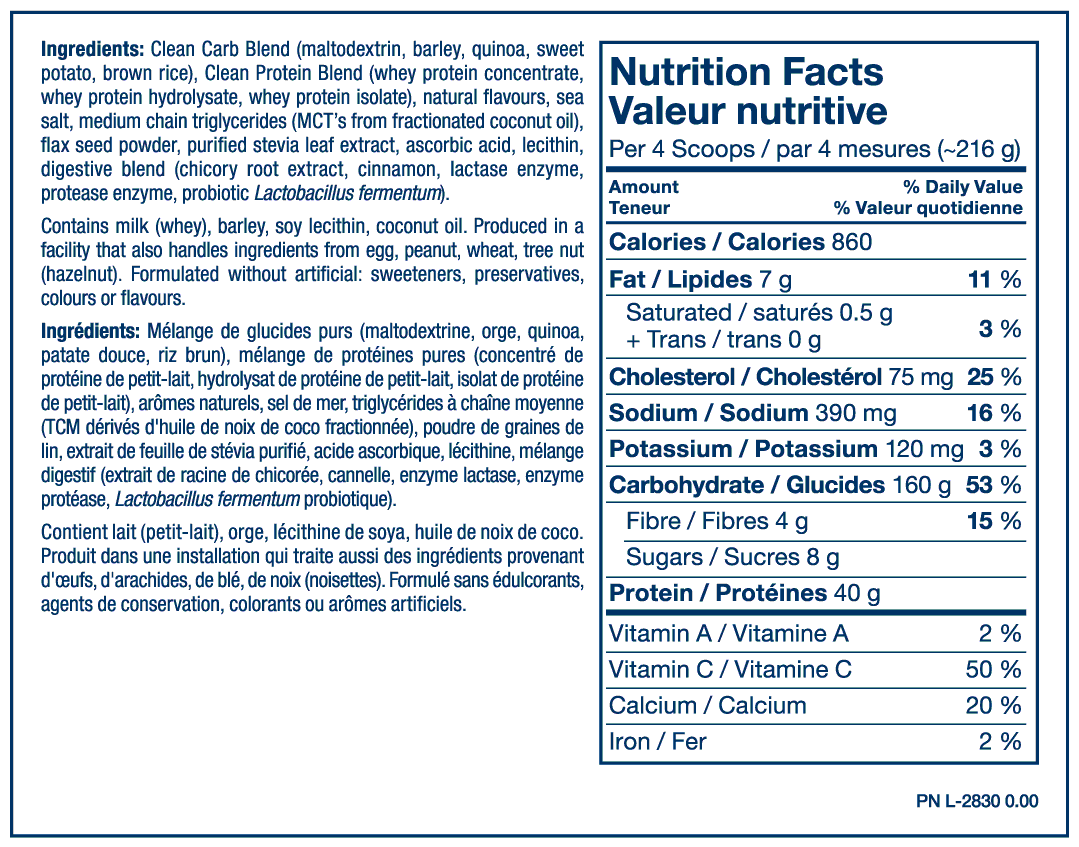 – Over 800 clean calories per serving with multiple real food carb sources